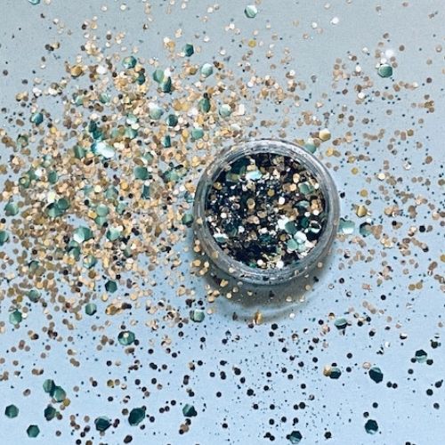 Our Aquamarine is a blend of blue, silver and gold glitter and looks green/gold.